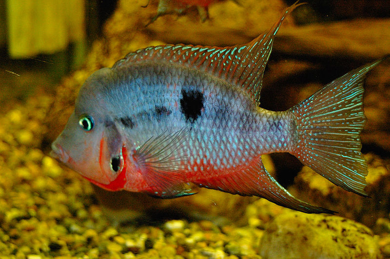 It has also been reported to live in underground cave systems. As fish with a tropical distribution, firemouth cichlids live in warm water with a temperature range of 23–30 °C (75–86 °F). The common name, firemouth, is derived from the bright orange-red colouration on the underside of the jaw. Males in particular flare out their gills, exposing their red throats, in a threat display designed to ward off male rivals from their territory. Like most cichlids, brood care is highly developed; this species is an egg-layer. Firemouth cichlids form monogamous pairs and spawn on flattened surfaces of rocks, leaves or submerged wood. Breeding males are primarily responsible for territorial defense, while females are more intensively involved in raising the fry, though both parents lead the fry in search of food. Firemouth cichlids are omnivorous and opportunistic in their feeding strategies. Their ability to protrude their jaw 6% standard length limits their diet to about 6% evasive prey. Sexual dimorphism is present, though limited in this species. Males are generally larger, (up to 15 cm), than females with brighter and more red colouration around the throat, they also have more pointed dorsal and anal fins. Firemouths are suitable for community aquaria, though they may become aggressive to other members of its species during spawning.